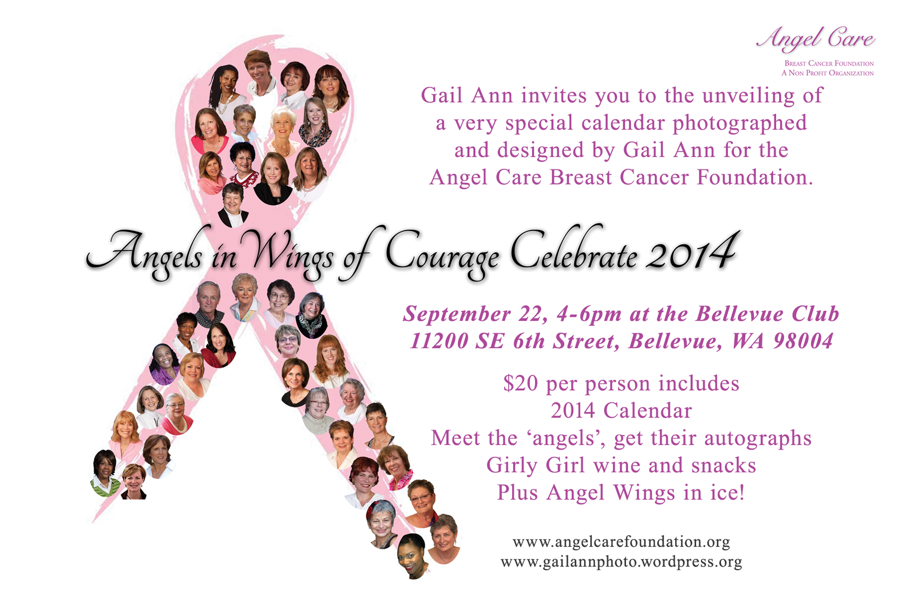 It was a marvelous party….Angel Care’s angels showed off their “Wings of Courage” in the just released calendar for 2014 at The Bellevue Club. Friends, family and fans were on hand to meet and greet the ‘angels’, sip Girly Girl wine and have their photo taken in front of a set of wings carved in ice! Calendars are on sale now for only $15.